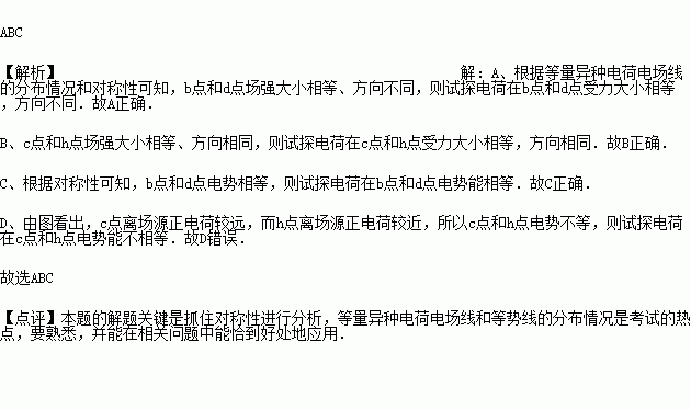 如图,有一对等量异种电荷分别位于空间中的a点和f点,以a点和f点为顶点作一正立方体.现在各顶点间移动一试探电荷,关于试探电荷受电场力和具有的电势能以下判断正确的是( )