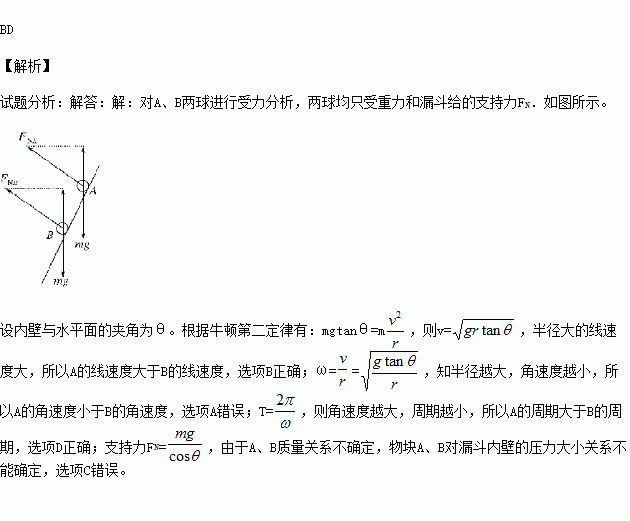 如图所示,在固定的圆锥形漏斗的光滑内壁上,有两个小物块A和B,质量分别为mA和mB,它们分别紧贴漏斗的内壁在不同的水平面上做匀速圆周运动。则以下叙述正确的是( )