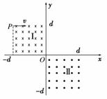 如图12所示,在第二象限和第四象限的正方形区域内分别存在着两匀强磁场,磁感应强度均为B,方向相反,且都垂直于xOy平面。一电子由P(-d,d)点,沿x轴正方向射入磁场区域Ⅰ。(电子质量为m,电量为e,sin 53°=4/5)