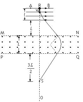 Èçͼ£¬¿Õ¼äÓÐһˮƽÏòÓÒµÄÓнçÔÈÇ¿µç³¡£¬ÉÏÏ¿í¶Èl=12cm£¬Ñص糡ÏßÉϵÄA¡¢BÁ½µã¼äµÄ¾àÀëd£½8cm£¬ ABÁ½µã¼äµÄµçÊÆ²îUAB£½160V¡£Ò»´øÕýµçµÄÁ£×Ó£¬µçÁ¿q£½5.0¡Á10-10?C£¬ÖÊÁ¿m£½1.0¡Á10-20?kg£¬´Óµç³¡µÄÉϱ߽çRµãÑØµç³¡µÄ´¹ÏßRO·ÉÈëµç³¡£¬³õËÙ¶Èv0£½3¡Á106m/s¡£Á£×Ӵӵ糡µÄϱ߽ç·É³öµç³¡ºó£¬¾¹ýÎÞ³¡ÇøÓò½øÈëˮƽ½çÃæÎªMN¡¢PQµÄÔÈÇ¿´Å³¡ÇøÓò£¬´Ó´Å³¡µÄPQ±ß½ç³öÀ´ºó¸ÕºÃ´òÔÚÖ±ÏßROÉÏÀëPQ±ß½ç ??L´¦µÄSµãÉÏ£¬Çҵ糡µÄϱ߽絽½çÃæMNµÄ¾àÀëÒÔ¼°Á½½çÃæMNÓëPQ¼äµÄ¾àÀë¾ùΪL¡£ÒÑÖªÁ£×Ó½øÈë½çÃæMNʱƫÀëÖ±ÏßROµÄ¾àÀëΪ24cm£¬Á£×ÓÖØÁ¦²»¼Æ¡£Çó£º