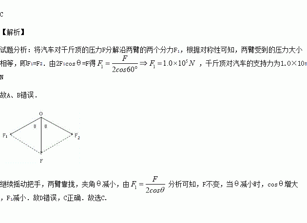 在玉树地震的救援行动中,千斤顶发挥了很大作用,如题图所示是剪式千斤顶,当摇动把手时,螺纹轴就能迫使千斤顶的两臂靠拢,从而将汽车顶起.当千斤顶两臂间的夹角为120°时汽车对千斤顶的压力为1.0×105N,下列判断正确的是 ( )