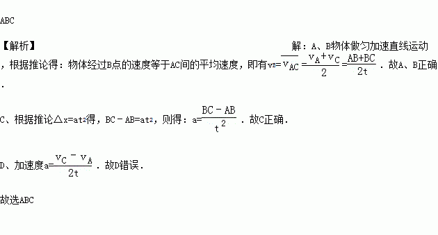 物体做匀加速直线运动,加速度为a,物体通过A点时的速度为vA,经过时间t到达B点,速度为vB,再经过时间t到达C点速度为vC,则有( )