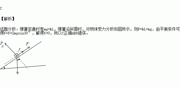 用轻弹簧竖直悬挂质量为m的物体,静止时弹簧伸长量为L。在下图中,斜面的倾角为30°,现用该弹簧 沿斜面方向拉住质量为2m的物体,系统静止时弹簧伸长量也为L。则物体所受摩擦力