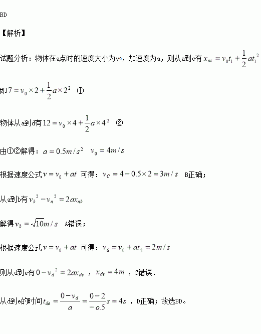(多选)如图所示,小球沿足够长的斜面向上做匀变速运动,依次经a、b、c、d到达最高点e。已知ab=bd=6m,bc=1 m,小球从a到c和从c到d所用的时间都是2 s,设小球经b、c时的速度分别为vb、vc,则( )