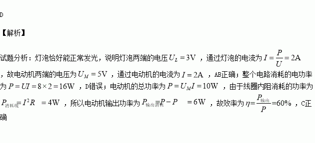 在如图所示的电路中,输入电压U恒为8 V,灯泡L标有“3 V,6 W”字样,电动机线圈的电阻R线=1 Ω。若灯泡恰能正常发光,下列说法错误的是( )