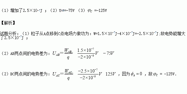 一条平直的电场线上有A、B、C三点,把m=2×10-9kg,q= -2×10-9C的粒子从A点移到B点,电场力做1.5×10-7J的正功,再把该电荷从B点移到C点,电场力做功-4×10-7J,求: