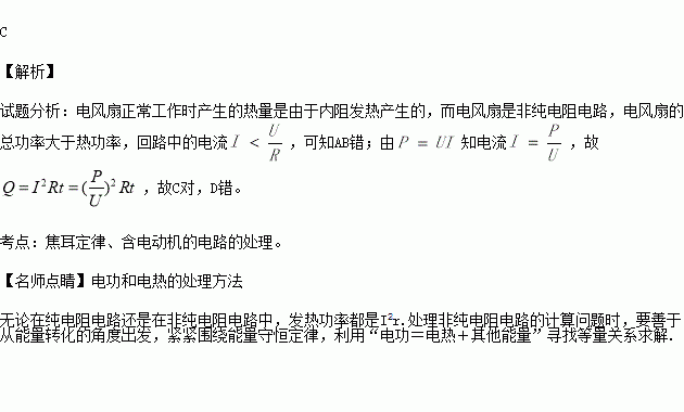 有一只风扇,标有“U、P”,电动机线圈电阻为R,把它接入电压为U的电路中,以下几种计算电风扇发热量的方法,正确的是 ( )