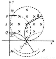 如图所示,平面坐标系中,圆形区域的匀强磁场,圆心坐标(R,R),半径为R,与坐标轴相切于A、C两点。今有两带相同电量的负电粒子甲、乙从P、Q两点分别以速度