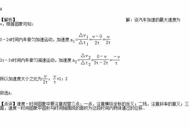 一辆公共汽车刚起步一小段时间后,发现一乘客未上车,司机立即采取制动措施.若此过程中汽车的运动在一条直线上,其速度﹣时间图象如图所示.那么,对于0﹣2t和2t﹣3t两段时间内加速度的关系,正确的是( )