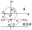 如图所示,圆心为原点、半径为R的圆将xOy平面分为两个区域,即圆内区域Ⅰ和圆外区域Ⅱ。区域Ⅰ内有方向垂直于xOy平面的匀强磁场B1。平行于x轴的荧光屏垂直于xOy平面,放置在坐标y=-2.2R的位置。一束质量为m、电荷量为q、动能为E0的带正电粒子从坐标为(-R,0)的A点沿x正方向射入区域Ⅰ,当区域Ⅱ内无磁场时,粒子全部打在荧光屏上坐标为(0,-2.2R)的M点,且此时,若将荧光屏沿y轴负方向平移,粒子打在荧光屏上的位置不变。若在区域Ⅱ内加上方向垂直于xOy平面的匀强磁场B2,上述粒子仍从A点沿x轴正方向射入区域Ⅰ,则粒子全部打在荧光屏上坐标为(0.4R,-2.2R)的 N点。求: