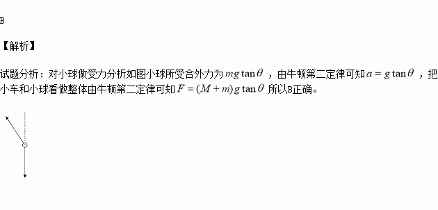 如图所示,小车质量为M,小球P的质量为m,绳质量不计。水平地面光滑,绳与竖直方向成θ角,小球P随车一起匀加速运动,则施于小车的水平作用力F是: