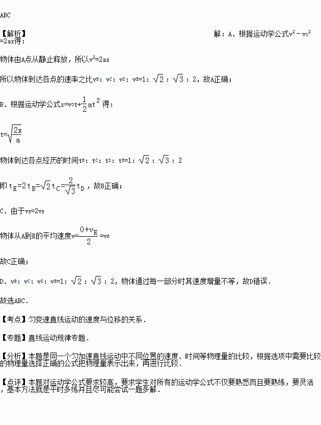 如图所示,光滑斜面AE被分成四个相等的部分,一物体由A点从静止释放,下列结论中正确的是( )