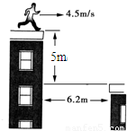 | C.如果要安全跳过去,他在屋顶水平跳跃速度应大于6.2m/s |