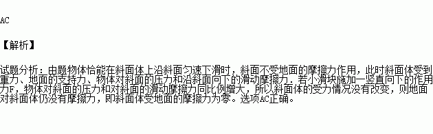 如图甲所示,斜面体静止在粗糙的水平地面上,斜面体上有一小滑块A沿斜面匀速下滑,现对小滑块施加一竖直向下的作用力F,如图乙所示两种情景下斜面体均处于静止状态,则下列说法正确的是