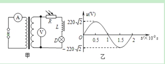 如图甲所示的电路中,理想变压器原、副线圈匝数比为10︰l,电流表、电压表均为理想电表,R、L和D分别是光敏电阻(其阻值随光强增大而减小)、理想线圈和灯泡。原线圈接入图乙所示的正弦交流电压u,下列说法中正确的是( )