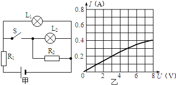 如图甲所示的电路中,电源电动势e=12V,内阻不计,R1=15Ω,R2=30Ω,它们都是阻值不随温度改变的定值电阻,白炽灯L1和L2相同,它们的I-U特性曲线如图乙所示,则当电键S断开时通过白炽灯L1的电流__________A。当电键S闭合时两个白炽灯消耗的总功率为__________W。