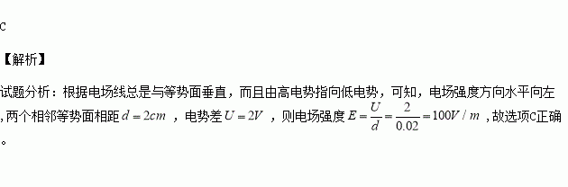 如图为某匀强电场的等势面分布图,每两个相邻等势面相距2cm,则该匀强电场的场强大小和方向分别为( )