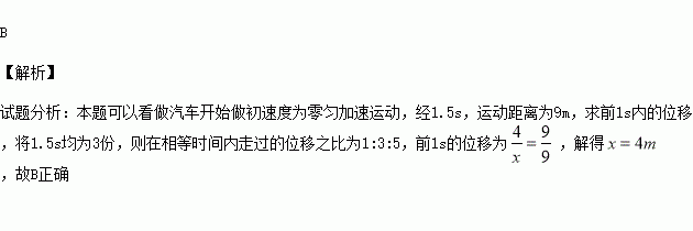 汽车遇突发情况紧急刹车,经1.5s停止,刹车距离为9 m.若汽车刹车后做匀减速直线运动,则汽车停止前最后1s的位移是: