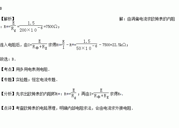 如图所示的电路为欧姆表原理图,电池的电动势E=1.5V,G为电流表,满偏电流为200μA.当调好零后,在两表笔间接一被测电阻Rx时,电流表G的指针示数为50μA,那么Rx的值是( )
