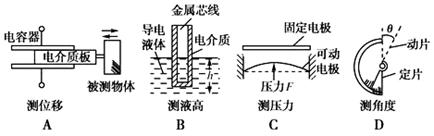 传感器是自动控制设备中不可缺少的元件,已经渗透到宇宙开发、环境保护、交通运输以及家庭生活等各种领域.如图所示为几种电容式传感器,其中通过改变电容器两板间距离而引起电容变化的是( )