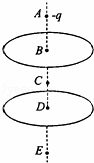 如图所示,两个相同的绝缘细圆环带有等量正电荷,电荷在圆环上的分布是均匀的,两圆环相隔一定距离同轴平行固定放置,B、D分别为两环圆心,C为BD中点.一带负电的粒子从很远处沿轴线飞来向下顺次穿过两环.若粒子只受电场力作用,则在粒子运动过程中( )