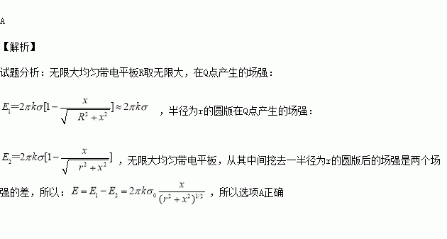 的无限大均匀带电平板,从其中间挖去一半径为r的圆孔,如图2所示。则圆孔轴线上任意一点Q(坐标为x)的电场强度为
