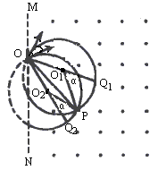 (2)如图示,以OP为弦可画两个半径相同的圆,分别表示在P点相遇的两个粒子的轨道,圆心分别为O1和O2,在O处两个圆的切线分别表示两个粒子的射入方向,它们之间的夹角为α,由几何关系知 ∠PO1Q1=∠PO2Q2=α 从O点射入到相遇,粒子1的路程为半个圆周加弧长