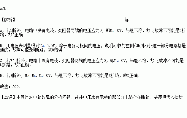 用电压表检查图示电路中的故障,测得Uad=5.0V,Ued=0V,Ube=0V,Uab=5.0V,则此故障不可能是( )