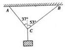 :轻绳的两端A、B固定在天花板上,绳能承受的最大拉力为120N.现用挂钩将一重物挂在绳子的结点C处。如图所示,两端与竖直方向的夹角分别为37°和53°.求: