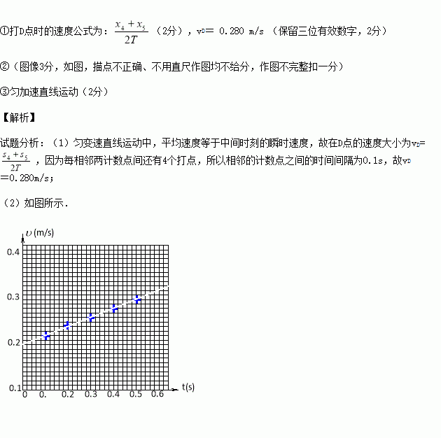 ①测得C.D两点间距x4=2.70 cm,D.E两点间距x5=2.90 cm,则根据此数据计算:在打D点时的速度公式为______(2分)(用x4、x5、T表示),小车的速度值vD= m/s(保留三位有效数字,2分)