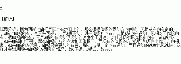 如图所示,由于风的缘故,河岸上的旗帜向右飘,在河面上的两条船上的旗帜分别向右和向左飘,两条船的运动状态是( )