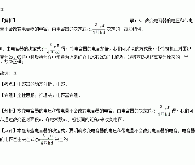一个空气平行板电容器,极板间距离为d,正对面积为s,充以电荷量Q后,极板间电压为U,为使电容器的电容加倍,可采用的办法是( )