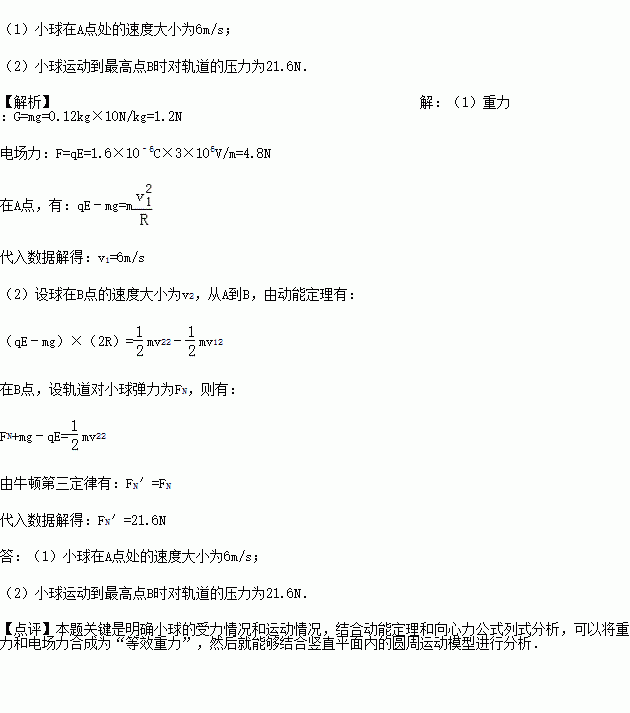 如图所示,内表面光滑绝缘的半径为1.2m的圆形轨道处于竖直平面内,有竖直向下的匀强电场,场强大小为3×106V/m.有一质量为0.12kg、带负电的小球,电荷量大小为1.6×10﹣6C,小球在圆轨道内壁做圆周运动,当运动到最低点A时,小球与轨道压力恰好为零,g取10m/s2,求: