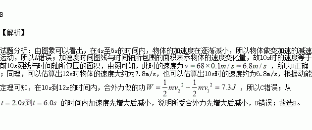 某研究性学习小组用加速度传感器探究物体从静止开始做直线运动的规律,得到了质量为1.0kg的物体运动的加速度随时间变化的关系图线,如图所示。由图可以得出( )