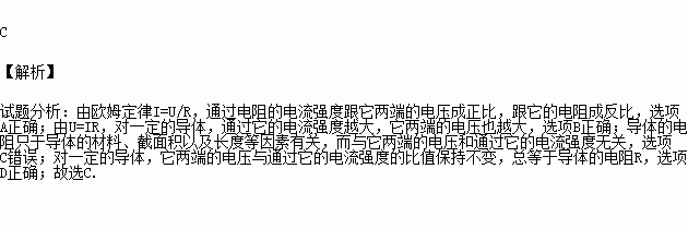 A. 由I=U/R,通过电阻的电流强度跟它两端的电压成正比,跟它的电阻成反比