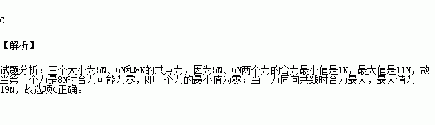 有三个大小分别为5N、6N和8N的共点力,它们的合力最大值和最小值分别为( )