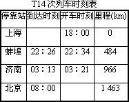 | 第四次提速后,出现了“星级列车”.从其中的T14次列车的时刻表可知,列车在蚌埠至济南区间段运行过程中的平均速率为( ) T14次列车时刻表