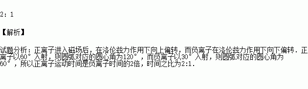 如图所示,在第一象限内有垂直纸面向里的匀强磁场,一对正、负离子(质量相同,电荷量相同,重力不计)分别以相同速度沿与x轴成30°角从原点射入磁场,则正、负电子在磁场中运动时间之比为