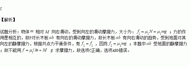 如图所示,质量为m的木块P在质量为M的长木板ab上滑行,长木板放在水平地面上一直处于静止状态.若长木板ab与地面间的动摩擦因数为μ1,木块P与长木板ab间的动摩擦因数为μ2,则长木板ab受到地面的摩擦力大小为( )
