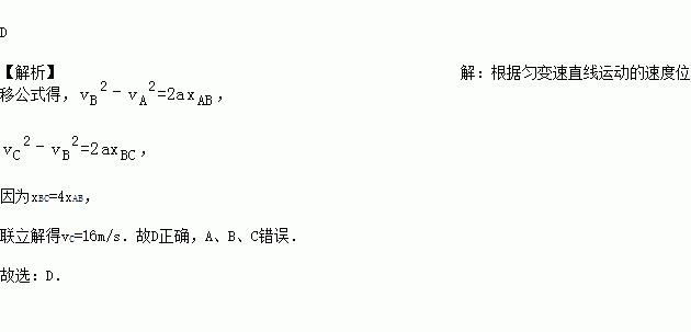 如图所示,平直的公路上有A、B、C三个路标,BC间距离是AB间距离的4倍,一辆汽车(可视为质点)沿AC方向作匀加速运动,已知汽车经过A、B两点的速度分别为4m/s、8m/s,则汽车经过C点的速度为( )