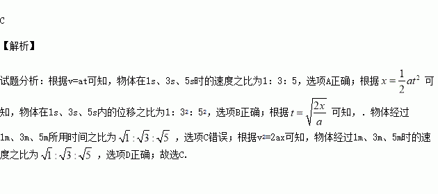 D.物体经过1m、3m、5m时的速度之比为![]()