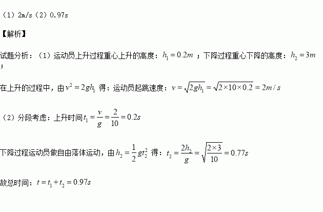 某跳水运动员从跳台3m起跳,到达最高点时他的重心离台面的高度为1m,当他下降到手触及水面时要伸直双臂做一个反掌压水花的动作,这时他的重心离水面也是1m,设他静止站在台面上时重心距台面的高度为0.8m,重力加速度