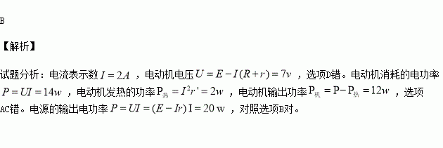 如图所示,电源电动势为12V,电源内阻为l.0Ω,电路中的电阻R为1.5Ω,小型直流电动机M的内阻为0.5Ω,闭合开关S后,电动机正常转动时,电流表的示数为2.0A。则以下判断中正确的是( )
