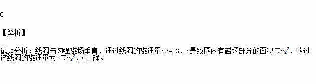 如图所示,匝数为N、半径为r1的圆形线圈内有匀强磁场,匀强磁场在半径为r2的圆形区域内,匀强磁场的磁感应强度B垂直于线圈平面。通过该线圈的磁通量为( )