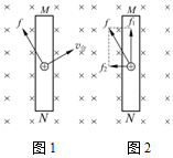 所以自由电荷沿导体棒由N向M定向移动,自由电荷实际的速度方向和所受洛伦兹力的方向如图1所示.![]()