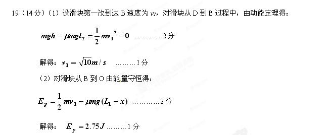 (1)滑块第一次到达B处的速度;(2)弹簧储存的最大弹性势能;