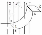 如图所示,两根等高的四分之一光滑圆弧轨道,半径为r、间距为L,图中oa水平,ob竖直,在轨道顶端连有一阻值为R的电阻,整个装置处在一竖直向上的匀强磁场中,磁感应强度为B。现有一根长度稍大于L、质量为m、电阻不计的金属棒从轨道的顶端ab处由静止开始下滑,到达轨道底端cd时受到轨道的支持力为2mg。整个过程中金属棒与导轨接触良好,轨道电阻不计,求: