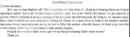 请以Good Habits Create Success 为题写一篇英文演讲稿,向全班同学介绍学习英语时养成良好学习习惯是最重要的。良好的习惯包括:课前做好预习,课堂上认真听讲,课后复习等。