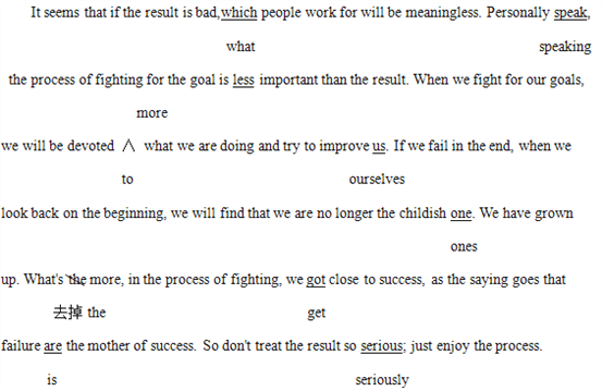 第三处:less改为more;考查比较级。根据下文的描述可知,此处指“为目标奋斗的过程比结果更重要”。故less改为more。