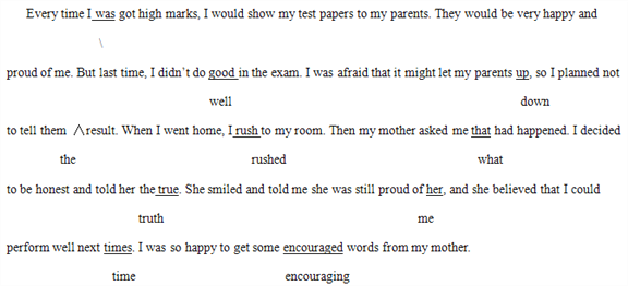 Every time I was got high marks, I would show my test papers to my parents. They would be very happy and proud of me. But last time, I didn’t do good in the exam. I was afraid that it might let my parents up, so I planned not to tell them result. When I went home, I rush to my room. Then my mother asked me that had happened. I decided to be honest and told her the true. She smiled and told me she was still proud of her, and she believed that I could perform well next times. I was so happy to get some encouraged words from my mother.